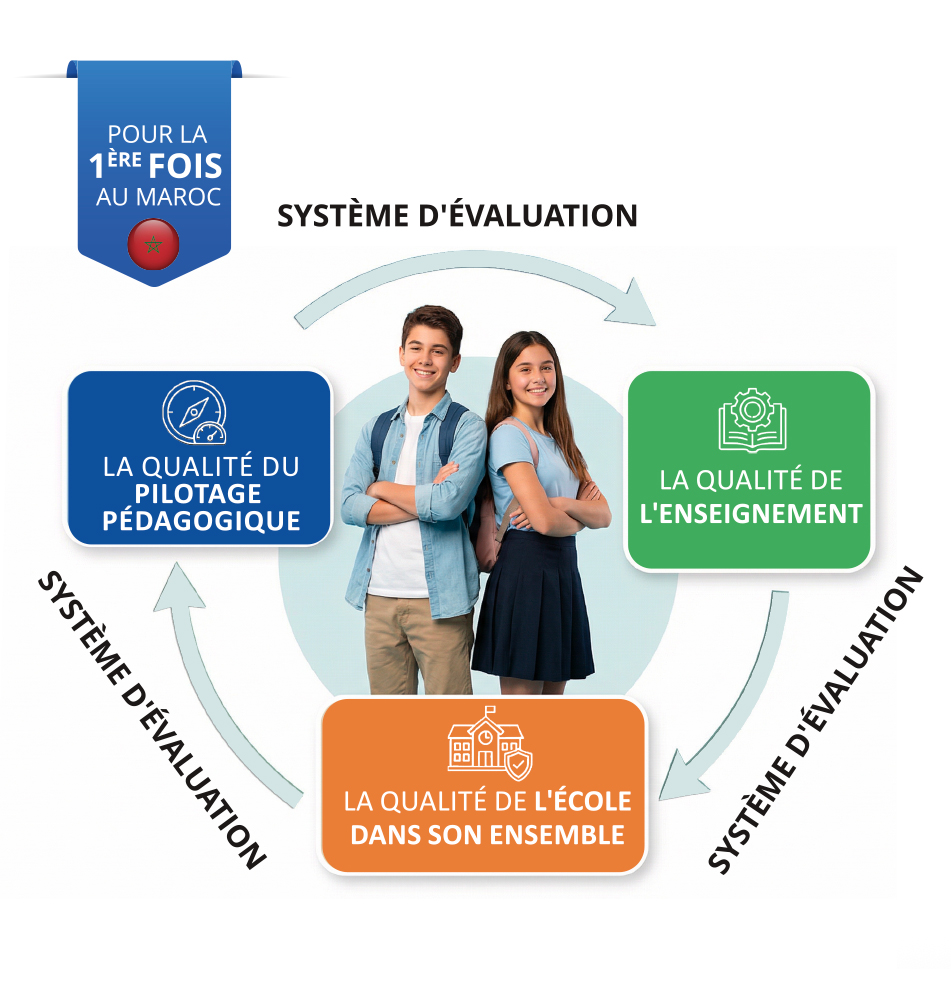 Le modèle repose sur trois piliers complémentaires et sur un système d’évaluation rigoureux: La qualité du pilotage pédagogique La qualité de l’enseignement en classe La qualité globale de l’école Ces piliers sont évalués régulièrement pour garantir leur efficacité réelle.